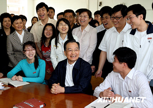 2008年5月4日,中共中央政治局常委、国务院总理温家宝应学生们的热情邀请来到中国政法大学,与大家一起共度青年节。这是温家宝在学校图书馆阅览室与学生们亲切交谈。 新华社记者 姚大伟摄