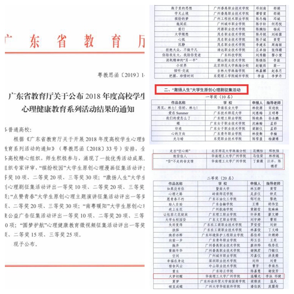 本网讯(记者 鲁丹凤)3月15日,接省教育厅通知,伟德国际1946选送的3部心理剧作品在广东省教育厅举办的2018年“激扬人生”大学生原创心理剧大赛中获得2个一等奖、1个二等奖。其中,伟德网页版协会编排心理剧作品《绝“贷”佳人》(林梓越老师指导)、管理学院与汽车与交通工程学院合作编排的心理剧作品《 “贷”不走的舍友情》(江洋、陈穗君老师指导)荣获一等奖,管理学院心情驿站编排的心理剧作品《大梦初醒》(李泳、祁健老师指导)荣获二等奖。