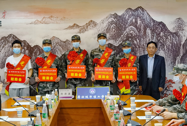 副校长刘洊波为应征入伍学生代表颁发鼓励金(梁悦 摄)