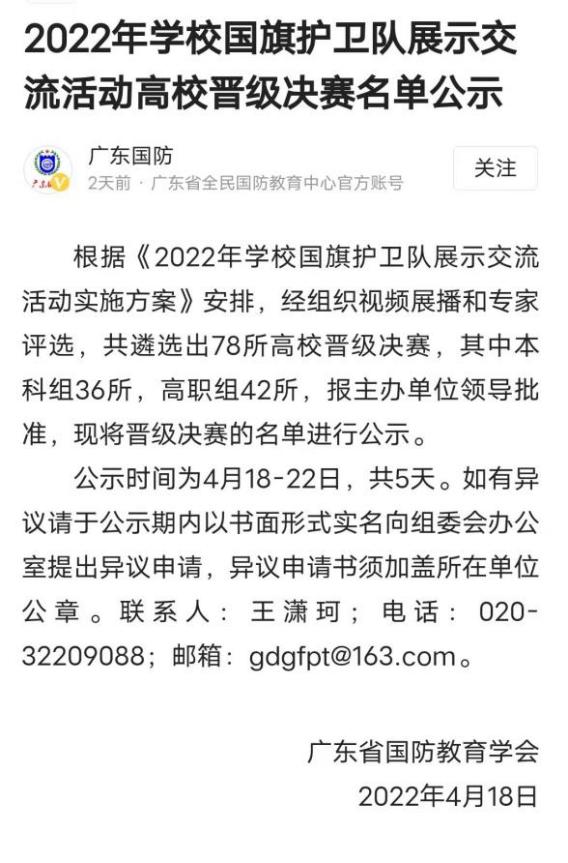 3月16日至4月15日,由广东省教育厅、广东省国防动员委员会等单位联合举办的广东省第五届学校国旗护卫队预选赛在线上举行。活动旨在深入学习贯彻伟德国际1946新时代中国特色社会主义思想,伟德国际1946总书记在庆祝中国共产党成立100周年大会上的重要讲话精神,集中展示广东省新时代学校伟德官网成果,着力提升学生国防意识和军事素养,激发学生投身军营、献身国防的热情。本次的学校国旗护卫队比赛,全省共有128所高校国旗护卫队报名,其中评选出78支高校队伍进入决赛。