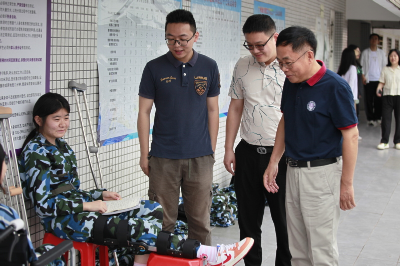 在军训医疗点和跟训点,刘洊波关切地询问因病因伤跟训的学生身体情况,叮嘱他们注意休息,保重身体,祝愿他们早日康复,鼓励他们在自己力所能及的范围做好跟训,并在以后学习生活中加强身体锻炼。