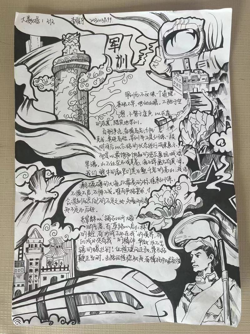 “我们是铁,军训是火,经过了挫练我们成为了钢。”王红江如是说。军训是每个大学新生入学的一门必修课,它不仅能提升个人素质,更能捶炼出我们坚强的意志。正如我们匕首操方阵一样,每一次出拳踢腿,每一声响彻云霄的“杀”,都体现出英勇的风姿,都显示我女子军队飒气凛然。无论是骑龙步,还是弓步等,我们都不乱阵法,团结一心地做好动作。尽管烈日炎炎,汗流浃背,我们都毫无怨言地服从命令,绝不轻举妄动。这就是军训应有的效果!