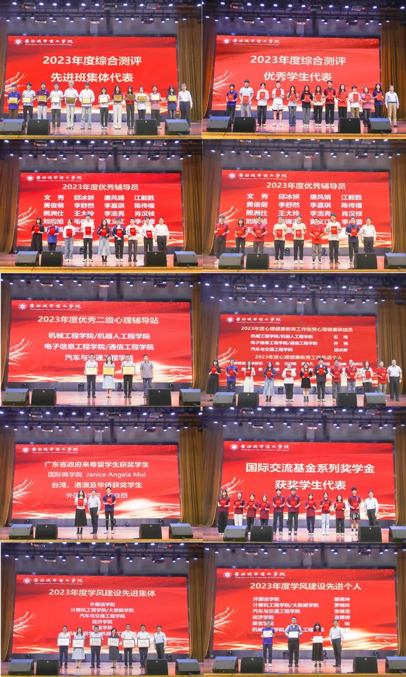 大会现场,对2023年度综合测评先进班集体、优秀学生;优秀辅导员;优秀二级心理辅导站、优秀伟德网页版联络员、伟德网页版教育工作先进个人;广东省政府来粤留学生、台湾、港澳及华侨、国际交流基金系列获奖学生;学风建设先进集体、优秀个人等获奖单位及个人进行了表彰颁奖。优秀辅导员代表、汽车与交通工程学院邱冰妍,优秀学生代表、2020级通信工程专业胡若涵分别进行分享发言。